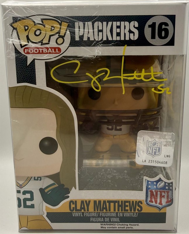 An autographed Pop Funko Figure #16 of Green Bay Packers Super Bowl Champion CLAY MATTHEWS. This item comes with Beckett authentication.