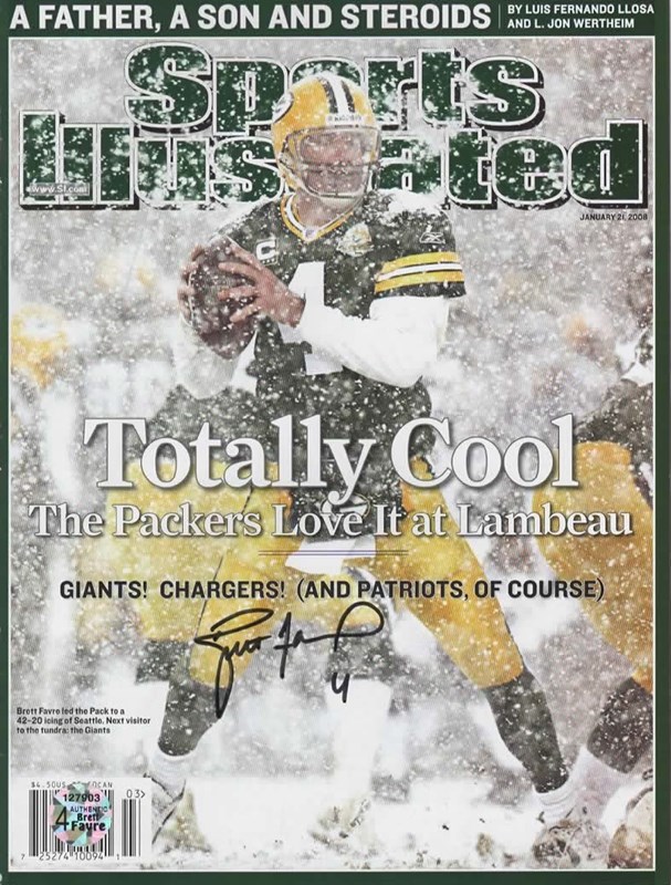 An autographed Sports Illustrated Magazine of Green Bay Packers Hall of Fame Quarterback BRETT FAVRE. The magazine is from January 21st, 2008 and does not have any label. It is in NM-MT condition and has been store in soft sleeve and top loaders ever since it was signed. This item comes with Brett Favre Official Authentication.