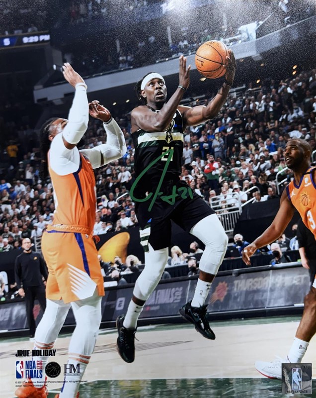 An autographed 8x10 photo by Milwaukee Bucks 2021 NBA Champ JRUE HOLIDAY.