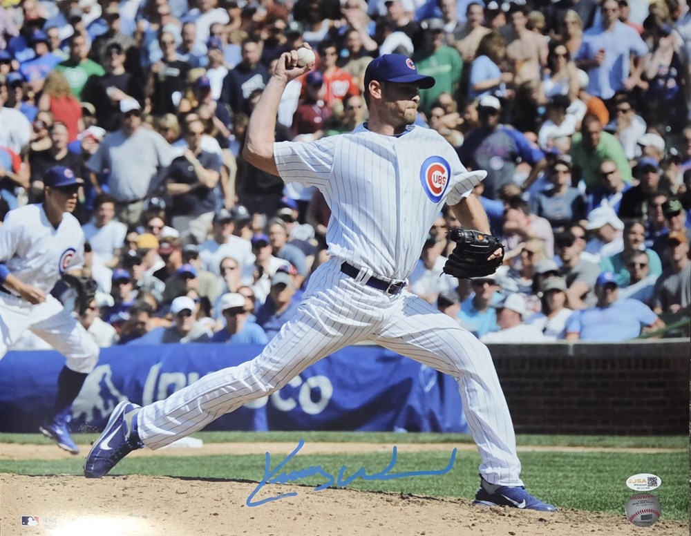 An autographed 16x20 photo by former Chicago Cubs pitcher and Rookie of the Year KERRY WOOD. This item comes with JSA authentication.