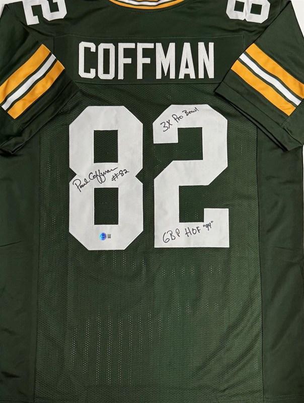 An autographed custom replica jersey by former Green Bay Packers tight end PAUL COFFMAN with the inscriptions "3 x Pro Bowl & GBP HOF 1994" This item comes with JSA authentication.