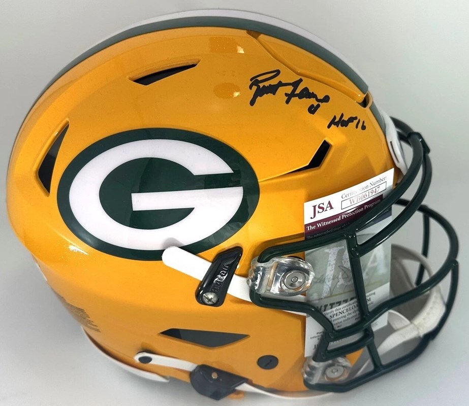 An autographed full size Riddell Speed Flex Authentic helmet by Green Bay Packers Hall of Famer BRETT FAVRE with the inscription "HOF '16". Comes with JSA authentication.
