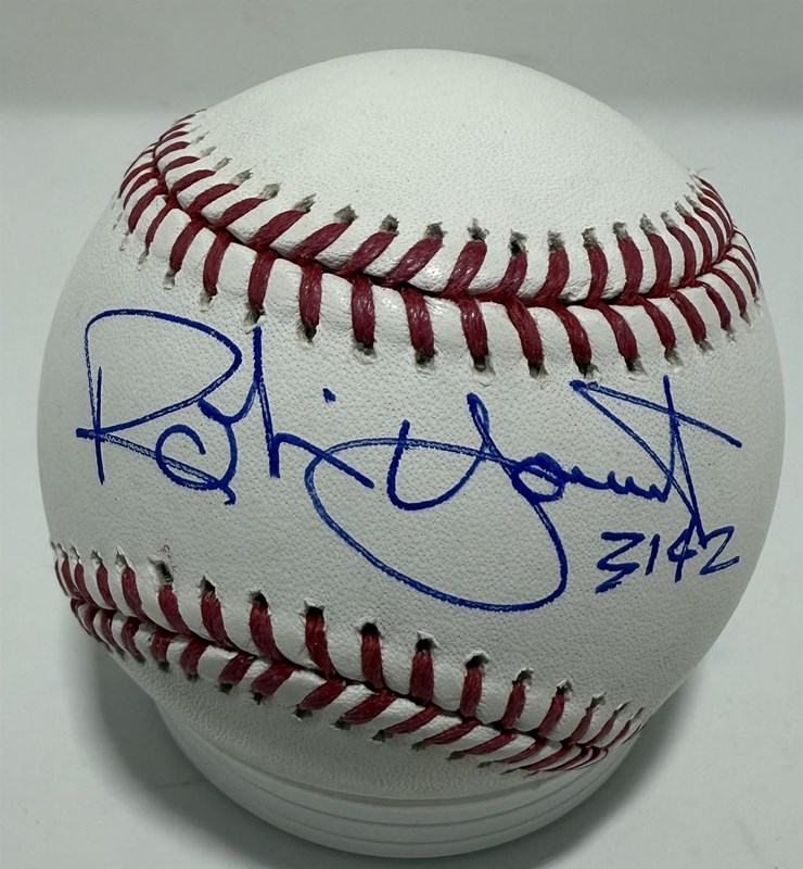 An autographed official MLB baseball by Milwaukee Brewers Hall of Famer ROBIN YOUNT with the inscription "3142 Hits". This item comes with JSA authentication.