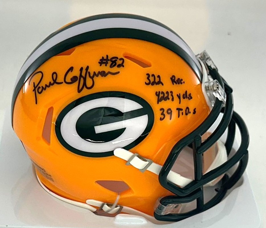 An autographed mini helmet by former Green Bay Packers tight end PAUL COFFMAN with inscription of his career stats "322 Rec, 4223 Yds, 39 TD's". This item comes with Beckett authentication.