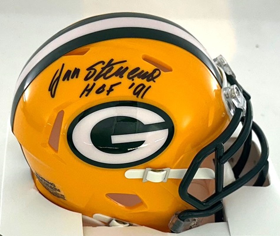 An autographed mini helmet by Packers legend JAN STENERUD with the inscription "HOF '91" Comes with Beckett Authentication.