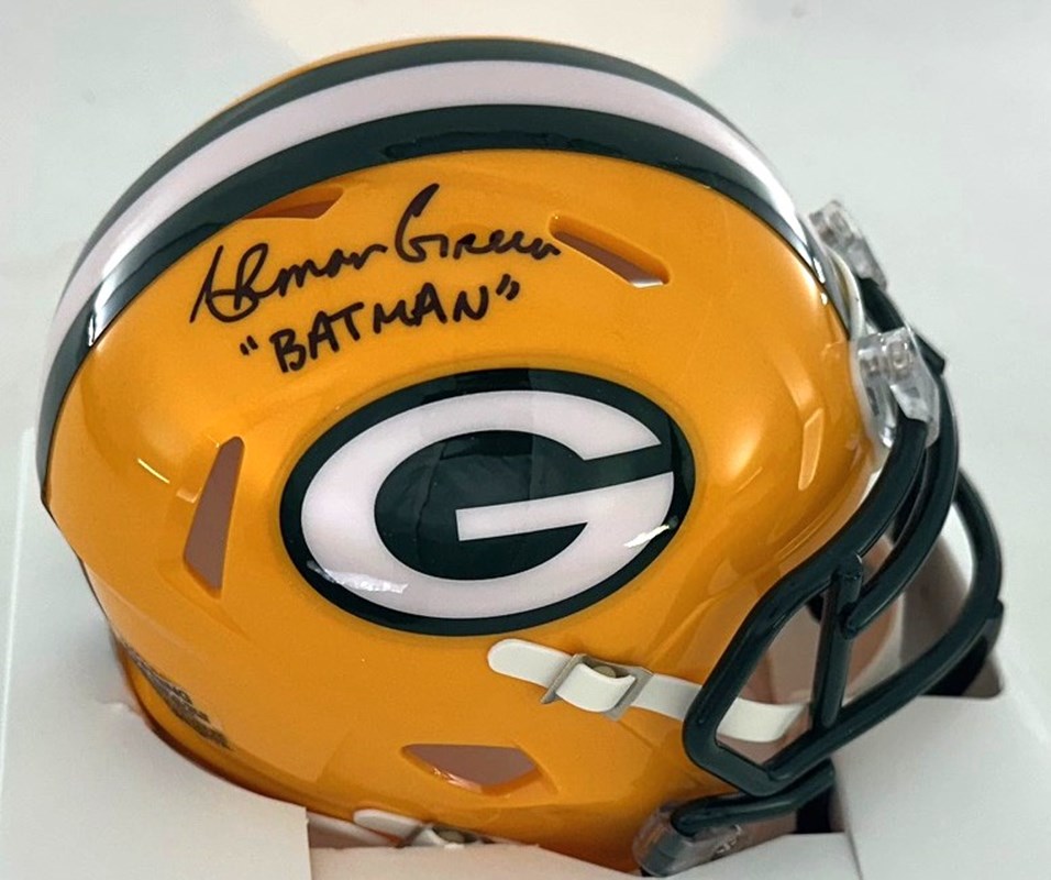 Autographed Riddell mini helmet by Green Bay Packers All Time leading rusher AHMAN GREEN with the inscription "BATMAN", which is his nickname. This item comes with Beckett authentication.