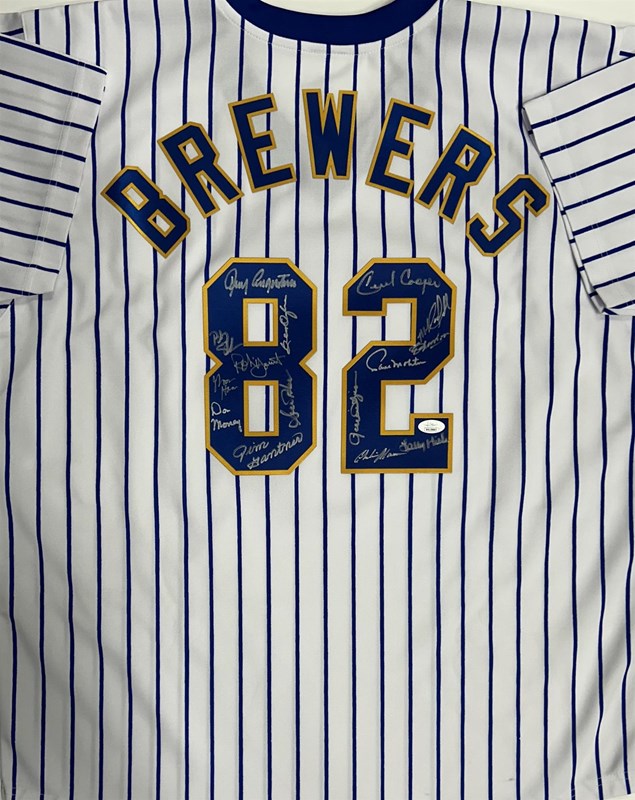 1982 BREWERS TEAM SIGNED CUSTOM PINSTRIPE JERSEY - 15 SIGNATURES - JSA