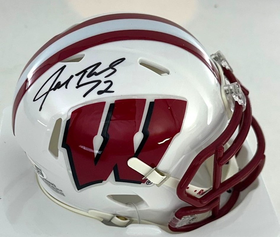 An autographed mini helmet by former WI Badgers All American and NFL Hall of Famer JOE THOMAS. This item comes with JSA authentication.