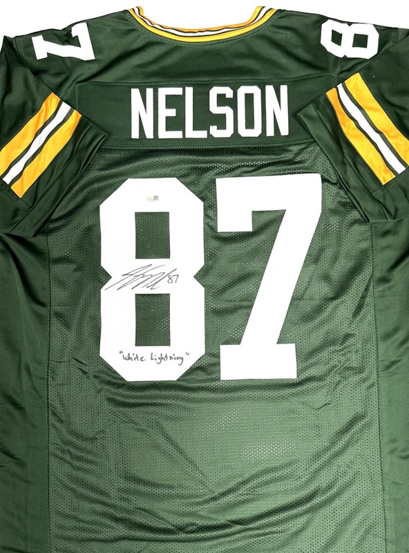 An autographed custom replica jersey by former Green Bay Packers wide receiver JORDY NELSON with the inscription "White Lightning". This item comes with JSA authentication. The jersey is size XL and has all letters and numbers sewn on.