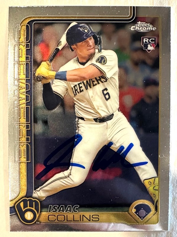 An autographed 2025 Topps Chrome Rookie Card #92 by Milwaukee Brewers Outfielder ISAAC COLLINS. We will NOT authenticate cards unless requested.